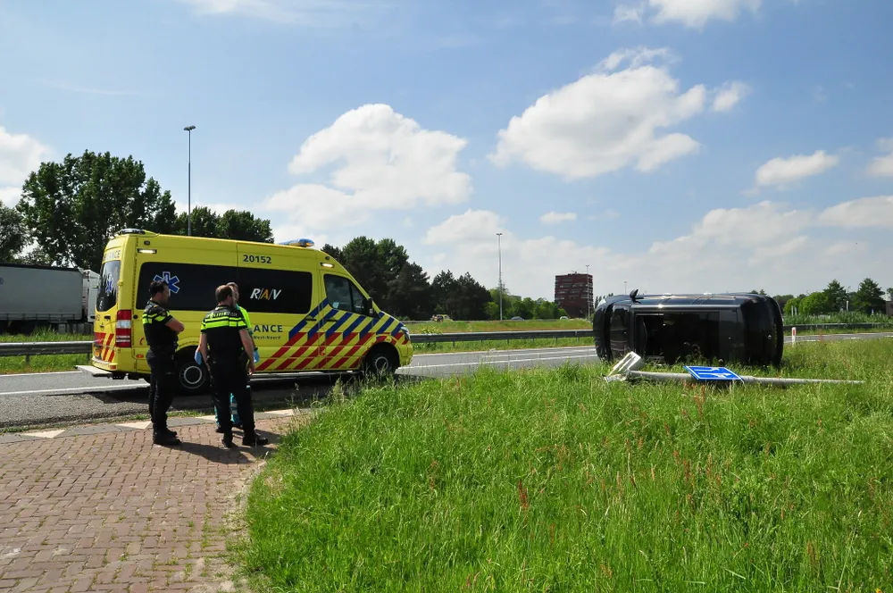 Een omstander heeft de bestuurder uit de auto bevrijd. De bestuurder is onderzocht door de ambulancedienst. Hij kwam er zonder kleerscheuren vanaf. Een berger is onderweg om de auto op te halen.
