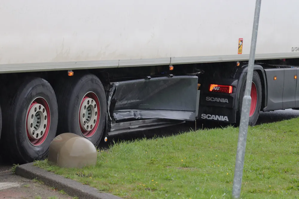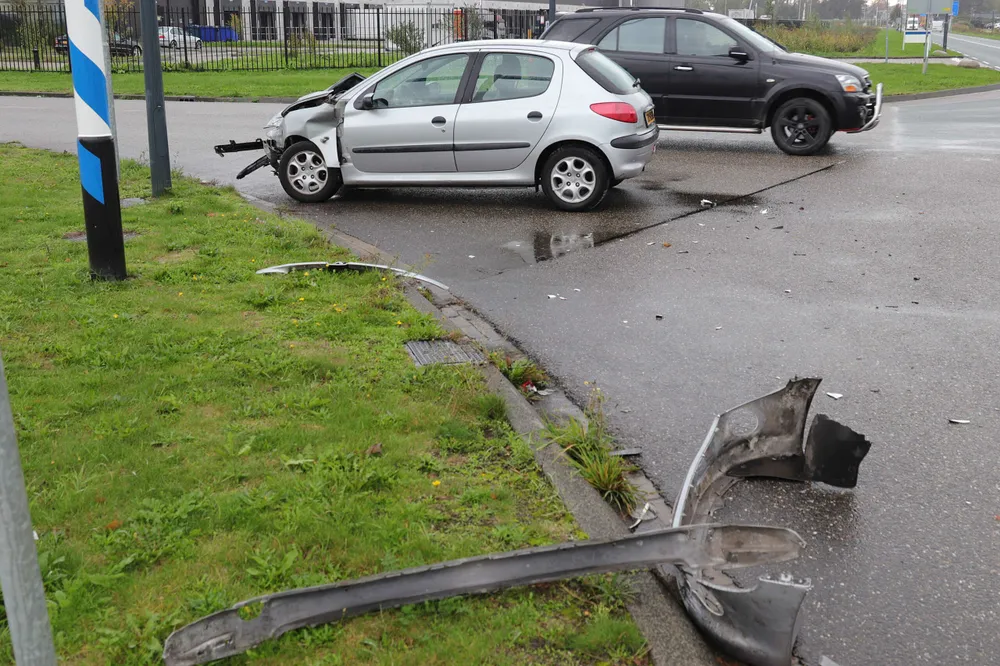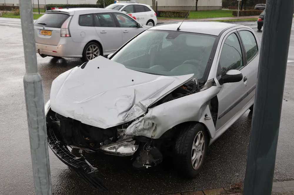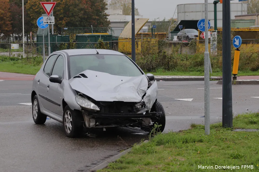 De bestuurder van de auto zag de vrachtwagen niet aankomen. Hij botste vervolgens met zijn auto tegen de zijkant van de vrachtwagen aan. De schade aan de auto is groot. Bij de aanrijding was niemand gewond geraakt.