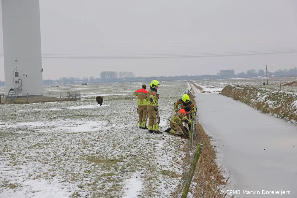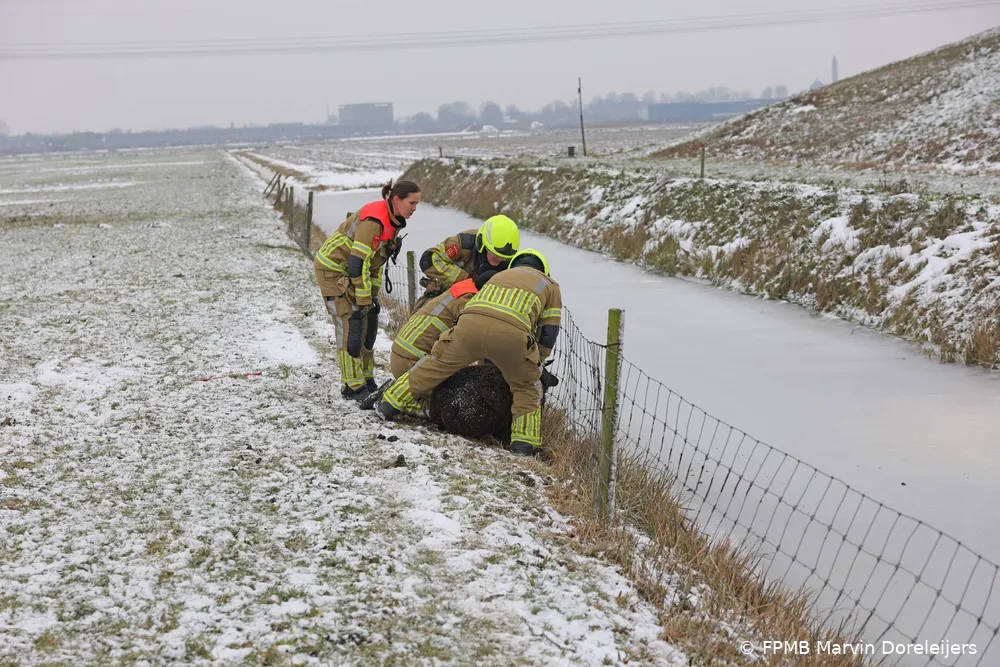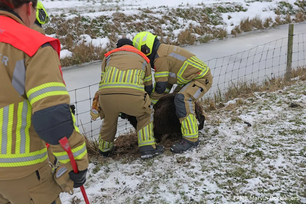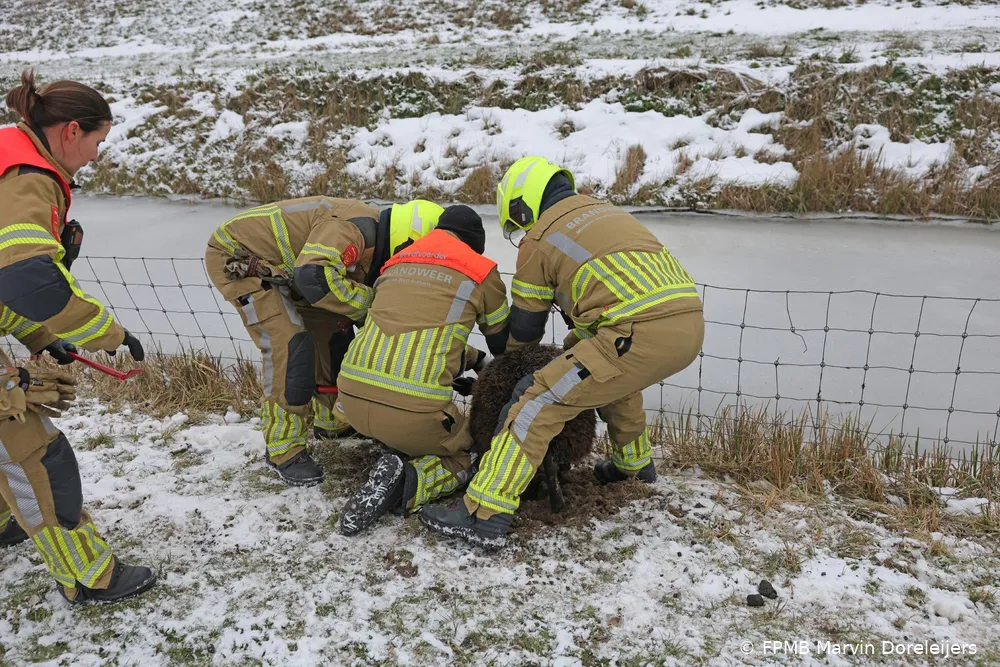Door de combinatie van sneeuwval en dooi was de weide drassig geworden. Een brandweervoertuig kon het terrein niet betreden. De brandweerlieden gingen daarom te voet het veld in, met reddingsmateriaal en een zware kniptang. Zo bereikten zij het schaap dat al geruime tijd vastzat.