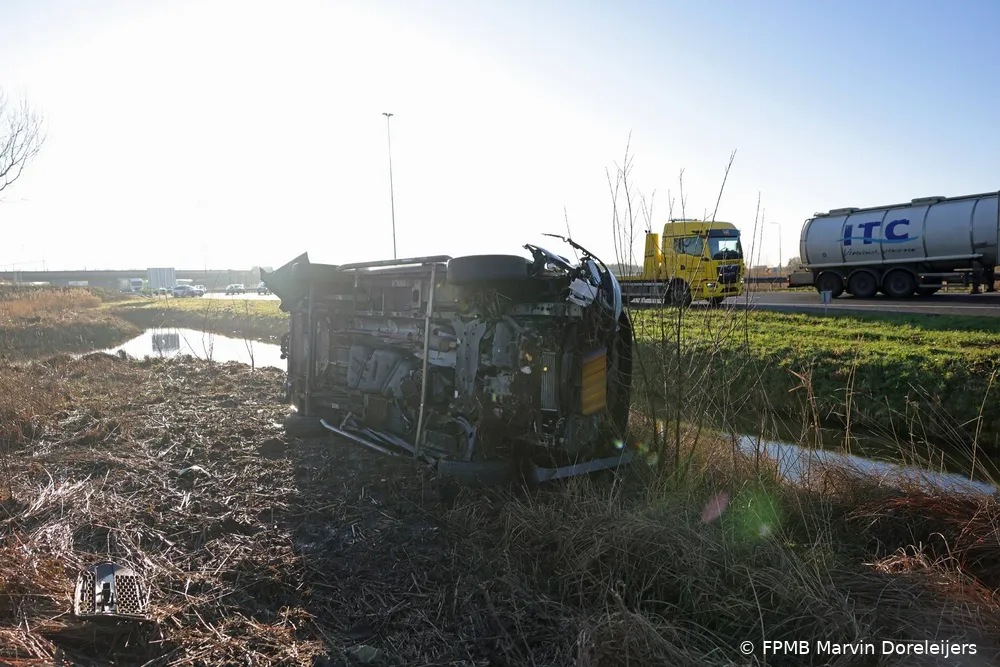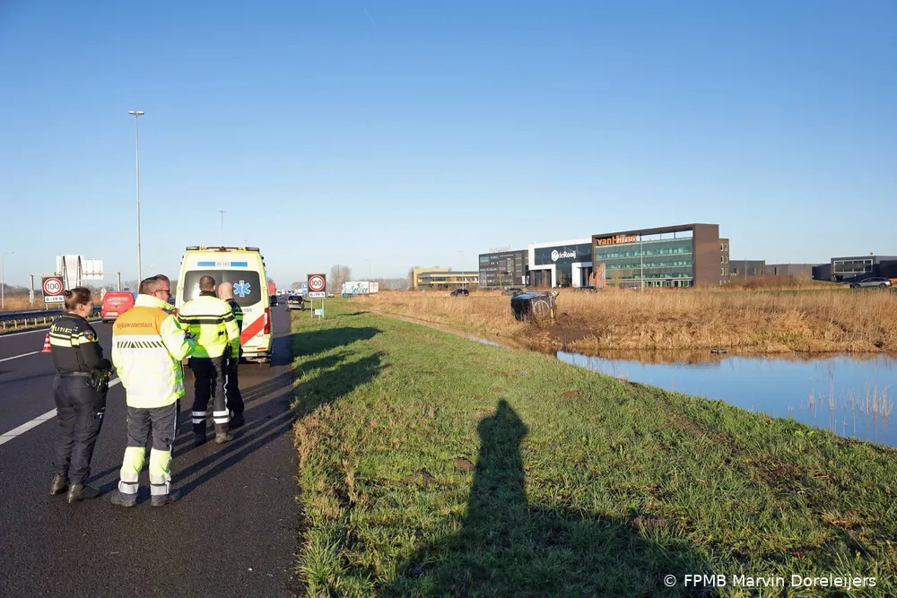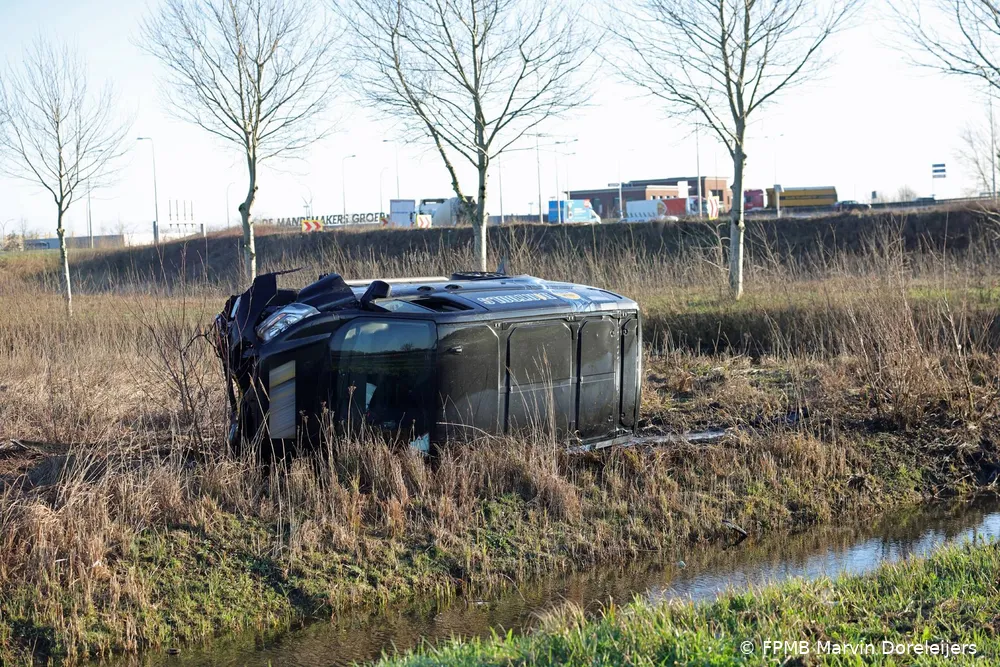 WAALWIJK – Een bestuurder van een bestelbus crashte woensdagochtend rond 08:15 uur op de A59 bij Waalwijk. Het voertuig raakte van de weg, sloeg over de kop, vloog over een sloot en kwam uiteindelijk in een weiland tot stilstand.