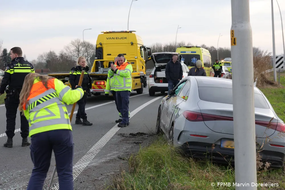 WAALWIJK – Op de A59 bij Waalwijk heeft maandagmiddag 22 december 2025 rond 13.30 uur een eenzijdig ongeval plaatsgevonden. Bij de afrit raakte een personenauto van de weg en kwam op zijn zijkant tot stilstand.