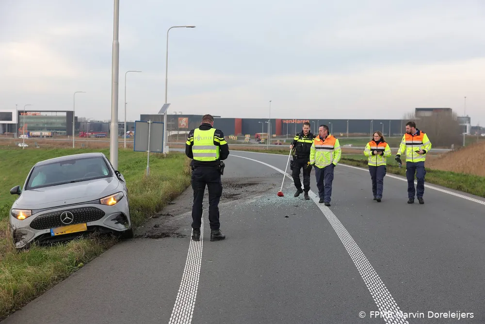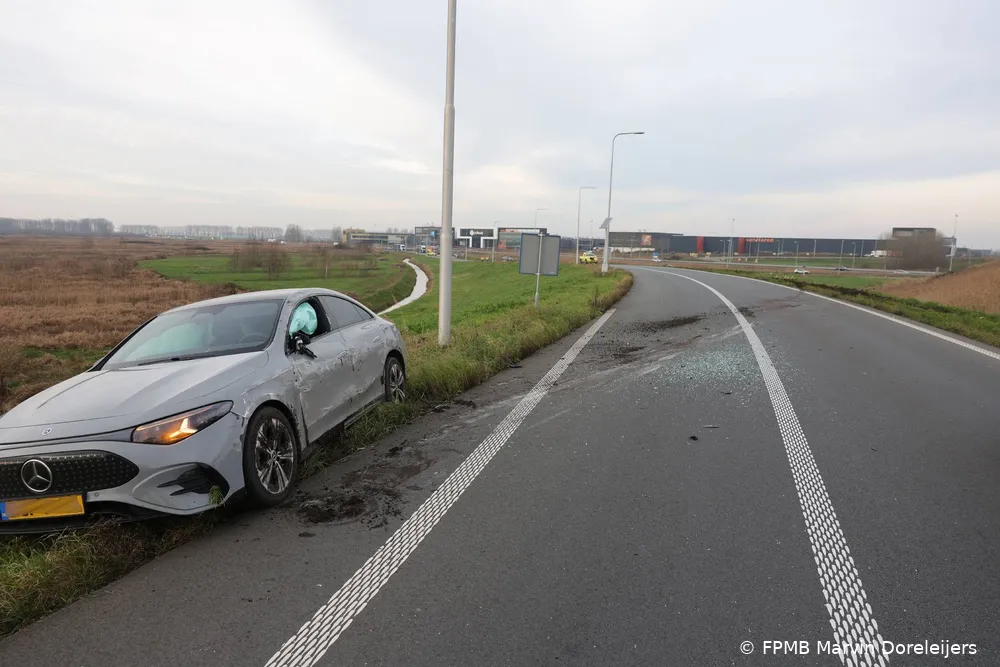 De bestuurder van een Mercedes-Benz, die pas enkele maanden oud was, verloor in een bocht bij de afrit de macht over het stuur. De auto kantelde en kwam naast de rijbaan op zijn zijkant tot stilstand. Door de ligging van het voertuig kon de bestuurder niet zelfstandig uitstappen.