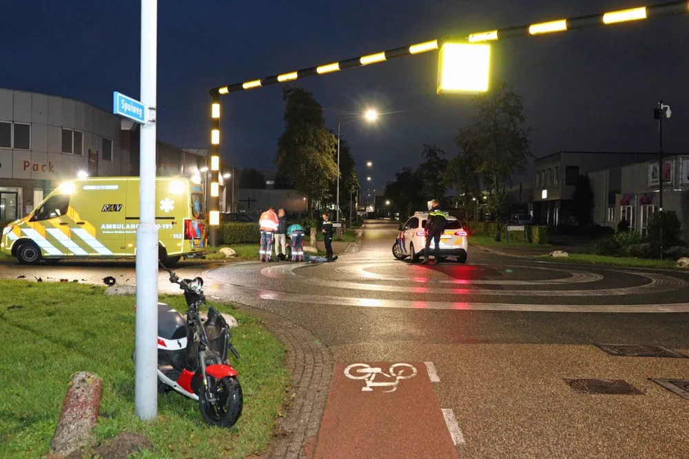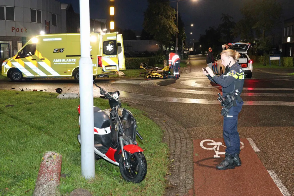 De man op de scooter raakte bij de aanrijding gewond en is direct overgebracht naar een ziekenhuis met onbekend letsel. De brokstukken van de scooter lagen verspreid over het wegdek.