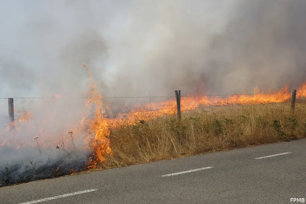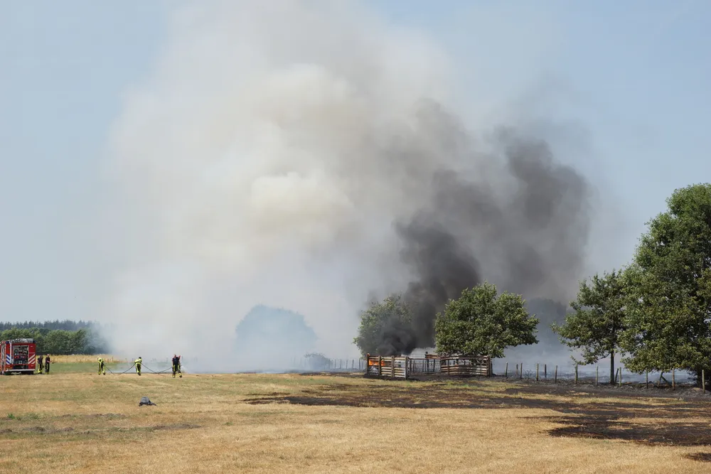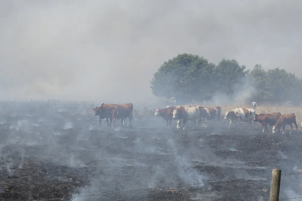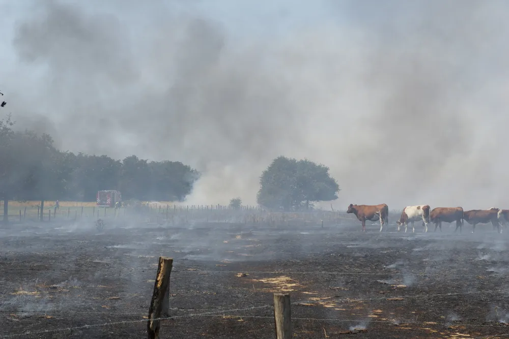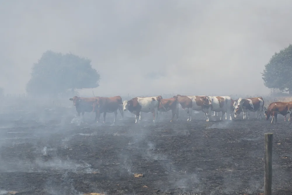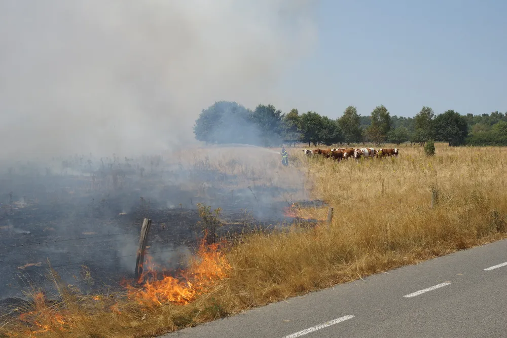 Aan het Spinderspad in Loon op Zand woedt sinds donderdagmiddag een heidebrand. Koeien die in de wei staan, worden van de vlammenzee weggehouden door omstanders.