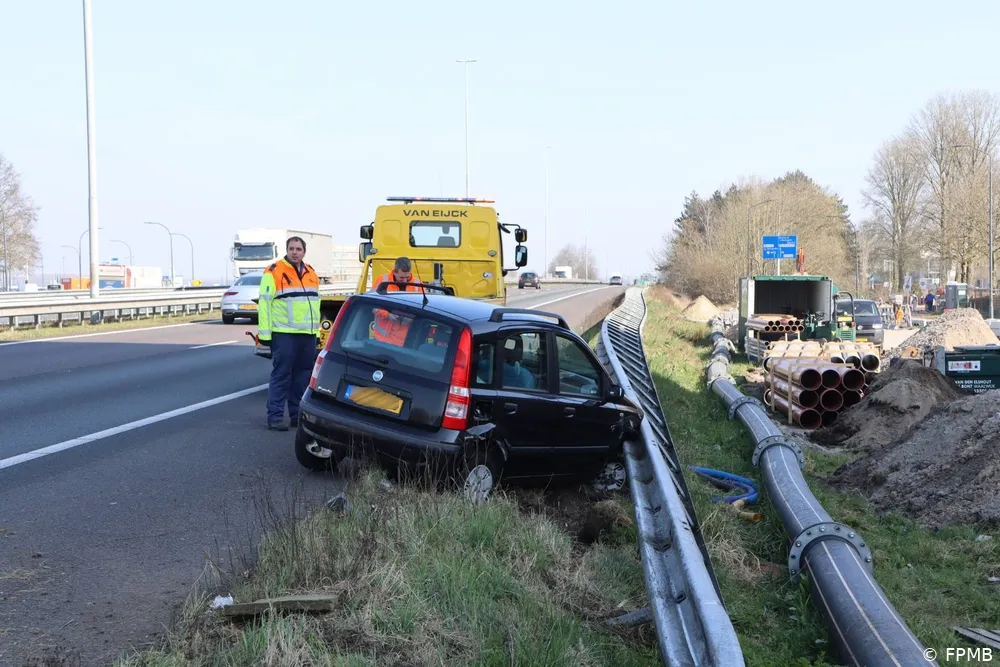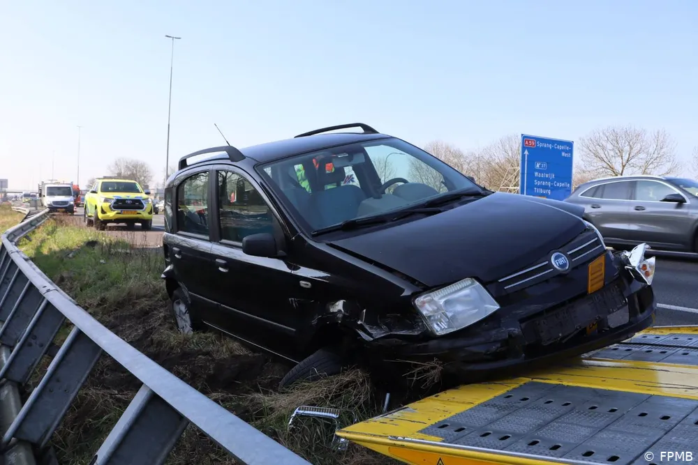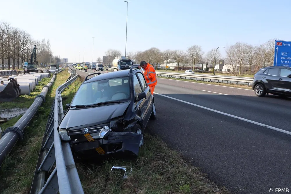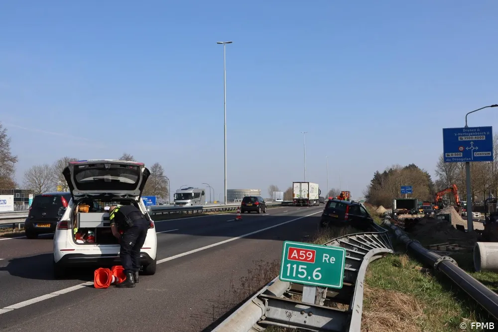WAALWIJK – Maandagmiddag 10 maart omstreeks 12:30 uur is op de A59 bij Waalwijk, ter hoogte van het gemeentehuis, een auto van de weg geraakt na een klapband. De bestuurster verloor de controle over het voertuig, botste eerst tegen de linker vangrail en schoot vervolgens naar de rechterkant, waar de auto uiteindelijk tot stilstand kwam.