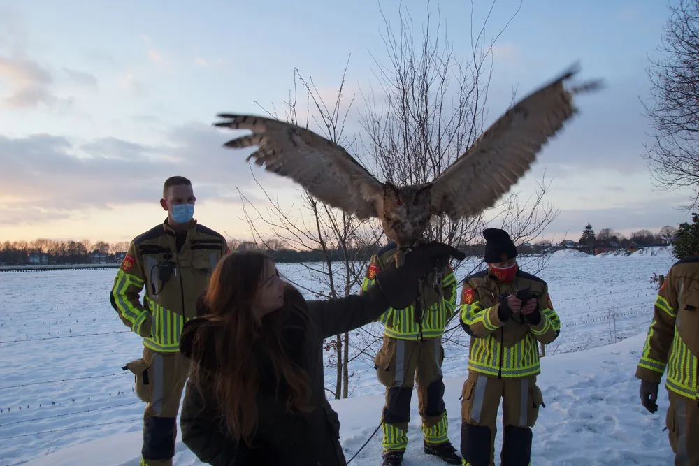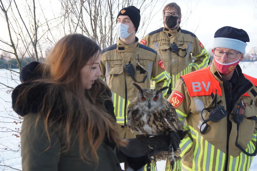 De brandweer kwam ter plaatse met een hoogwerker, maar die kon er niet bij komen waarna de brandweer van Sprang-Capelle werd gealarmeerd. Een langa ladder zorgde ervoor dat een boomexpert, die ter plaatse was gekomen, in de boom kon klimmen. Toen de man in de buurt kwam van de oehoe vloog de oehoe uit de boom en belandde uiteindelijk tientallen meters verderop in de bosschage. Het lukte de eigenaresse en de brandweer om de oehoe uiteindelijk te vangen.