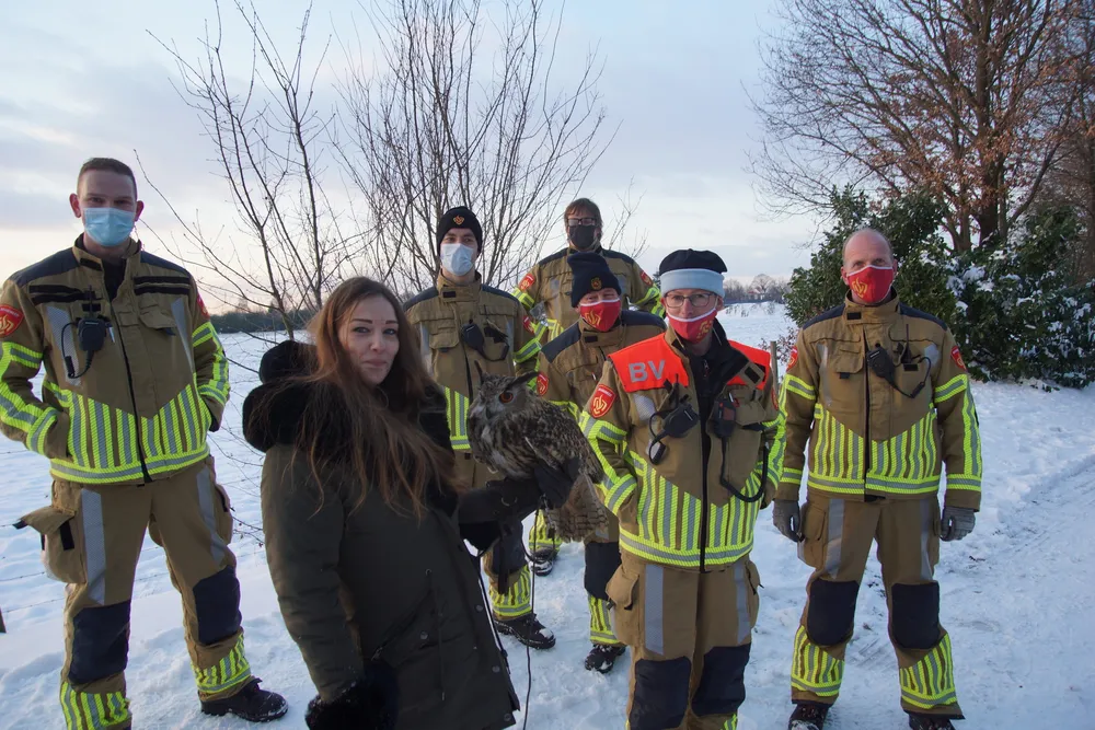 Na de inzet gingen ze met zijn allen nog op de foto. De oehoe heeft al met al toch zeker twee uur in de boom gezeten en was door het hele gebeuren uitgeput. Maar het was dus eind goed al goed.