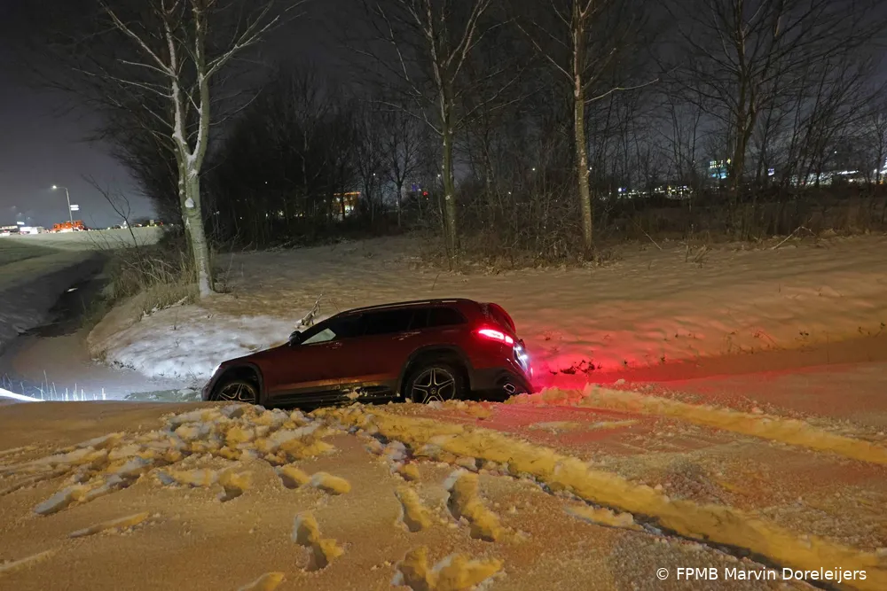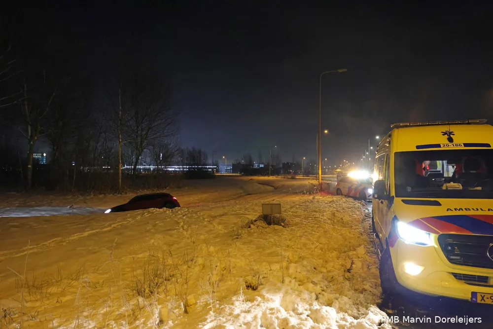 Volgens ooggetuigen reed de auto over een achtergebleven strook sneeuw. Daardoor begon het voertuig te slingeren. De bestuurder slaagde er niet in de auto onder controle te houden en gleed via de berm de sloot in naast de snelweg.