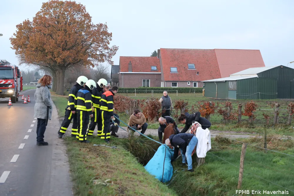 In de Pastoor Kampstraat in de Moer is vrijdagmiddag omstreeks 16.20 uur een paard plotseling in een smalle sloot terecht gekomen. De eigenaar liep met het paard langs de sloot toen het plotseling in het water viel. Waarschijnlijk schrok het ergens van.