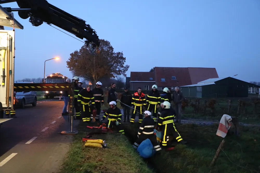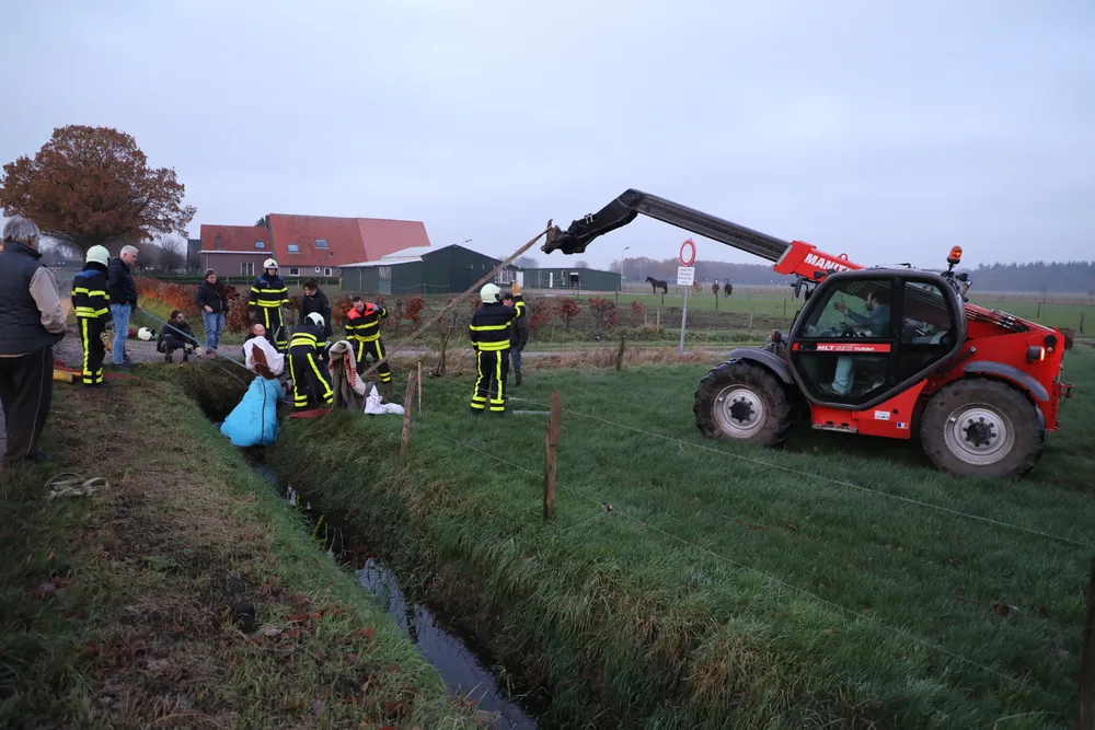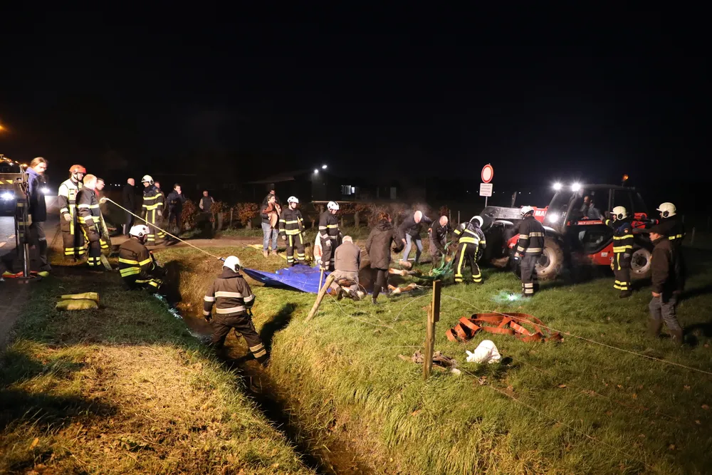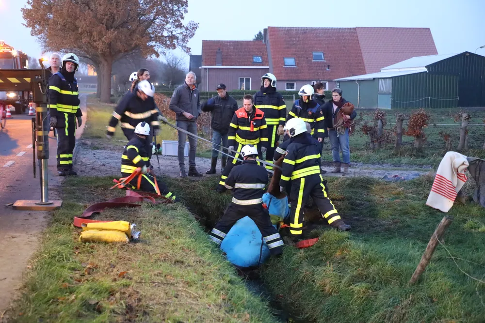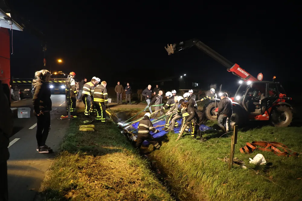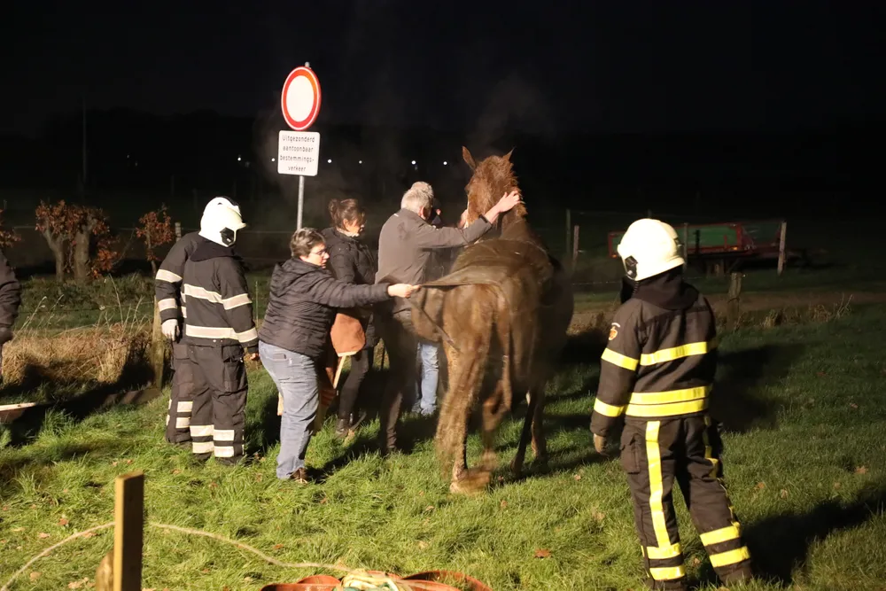 Met man en macht is geprobeerd het paard uit de sloot te trekken. De brandweer schoot met drie wagens te hulp: een gewone tankautospuit, een takelwagen en een speciale wagen voor gewond vee. Ook mensen uit de buurt kwamen helpen. Met brandweerslangen en kabels probeerden zij het dier uit de diepe greppel te tillen.