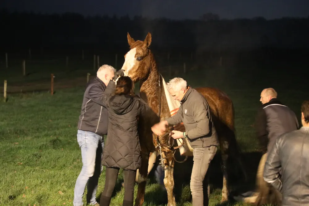Na ongeveer een minuut uithijgen stond het dier vanzelf weer op. Het was flink afgekoeld. Een dierenarts heeft het paard nagekeken. De rest van de avond mag het opwarmen in een stal in de buurt.