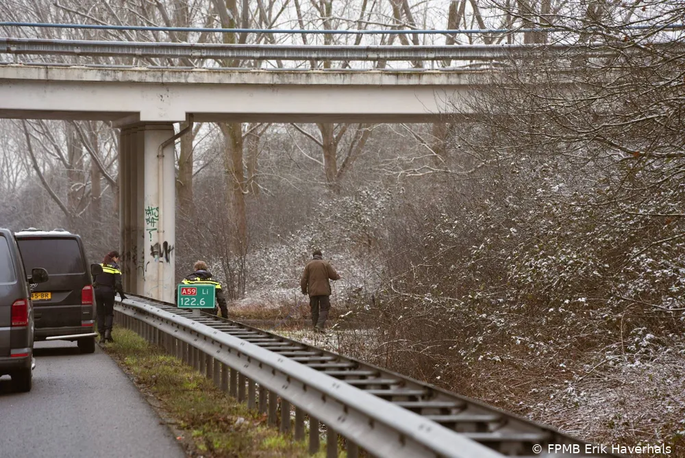 Agenten zijn met drie speurhonden bezig in de bermen langs de A59. Daarbij wordt gezocht naar mogelijke sporen van de verdachten en naar de route die zij na het incident hebben afgelegd.