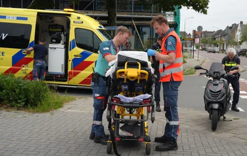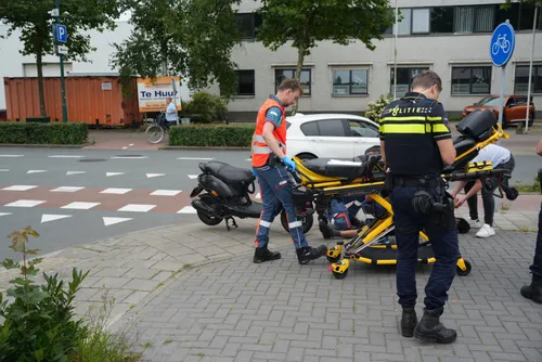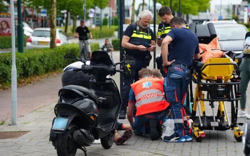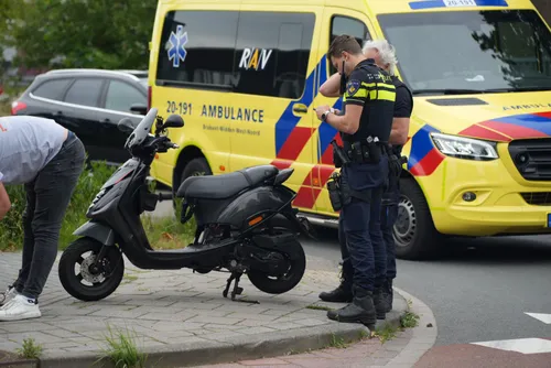 De jongen raakte hierbij gewond en is in een spalk op een brancard naar het ziekenhuis gebracht. De politie heeft de zwaar beschadigde scooter meegenomen. De auto liep lichte schade op.