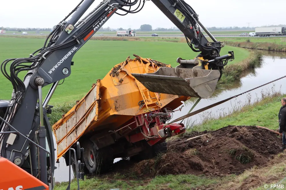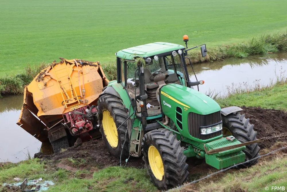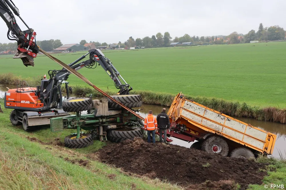 De bestuurder verloor door onbekende oorzaak de macht over het stuur en kwam onder aan de dijk tot stilstand. De aanhanger, volgeladen met grond, lag gedeeltelijk in het water, terwijl de tractor zelf op zijn kant terechtkwam.