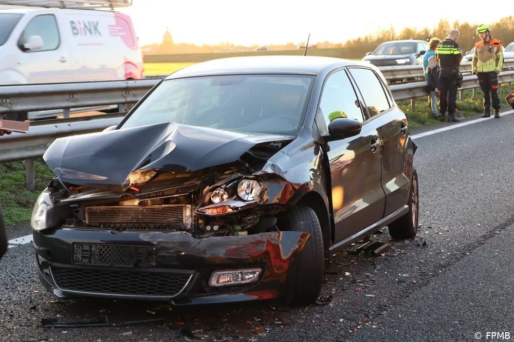 De voorste auto stond stil vanwege een file verderop richting Hooipolder, toen een tweede voertuig achterop reed. Een derde auto kon niet meer op tijd stoppen en botste eveneens op de stilstaande voertuigen.