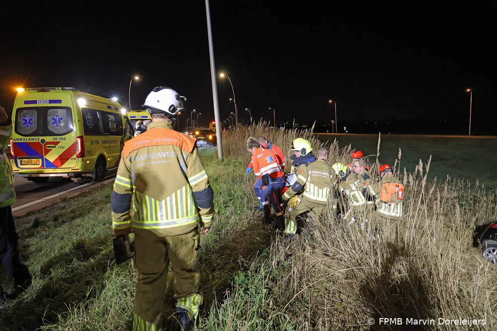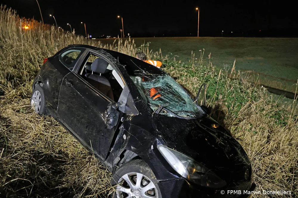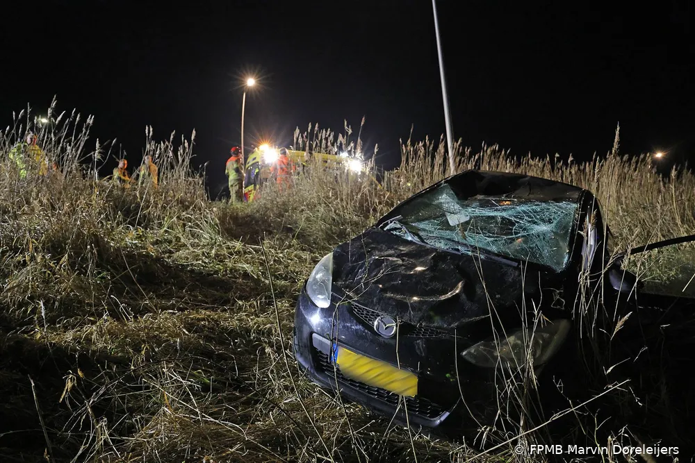 Een van de bestuurders wilde van rijbaan wisselen, maar dit ging mis. De auto botste tegen een andere wagen, waarna een van de voertuigen met twee inzittenden van de weg raakte. De auto sloeg over de kop en kwam onderaan het talud tot stilstand.