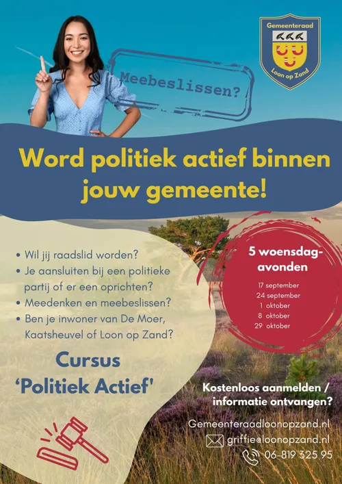 LOON OP ZAND – Na de zomer organiseert de gemeenteraad van Loon op Zand een cursus voor inwoners die geïnteresseerd zijn in lokale politiek. De cursus ‘Politiek Actief’ bestaat uit vijf inspirerende avonden in het gemeentehuis Het Klavier en is gratis toegankelijk voor iedereen van 18 jaar en ouder.