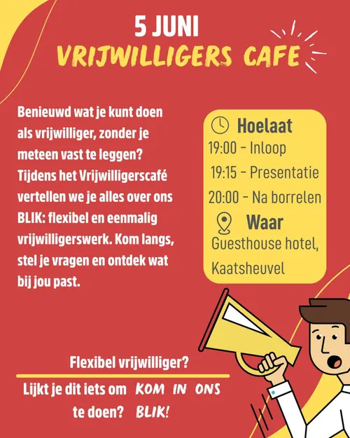 Lijkt het je iets om af en toe te helpen wanneer het jou uitkomt? Kom dan zeker langs op 5 juni en ontdek of jij ook onderdeel wilt zijn van ons ‘blik’ aan vrijwilligers!