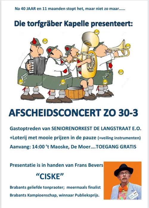 Op zondag 30 maart vindt het grote afscheidsconcert plaats. Het belooft een traditionele, gezellige middag te worden, met een gastoptreden van seniorenorkest De Langstraat en uiteraard een laatste optreden van Die Torfgräber Kapelle.