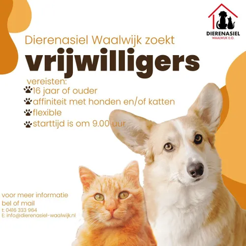 Dierenasiel Waalwijk zoekt enthousiaste vrijwilligers om te helpen bij de verzorging van de dieren die daar tijdelijk verblijven.