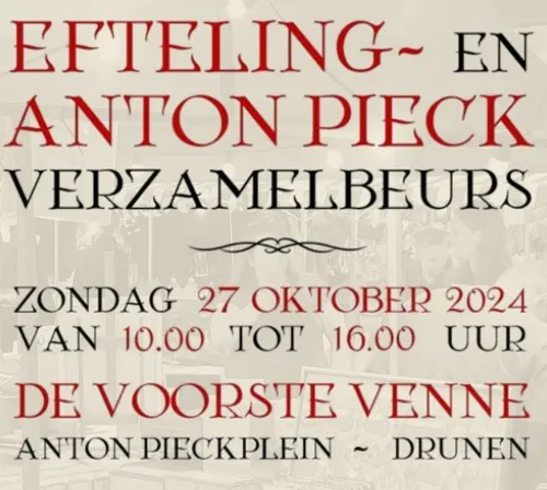De Efteling- en Anton Pieck Verzamelbeurs wordt gehouden op zondag 27 oktober 2024 in De Voorste Venne te Drunen. De deuren zijn geopend van 10:00 tot 16:00 uur. De entree bedraagt € 2,- (kinderen t/m 12 jaar gratis).