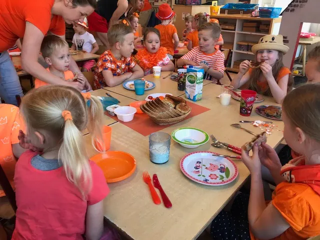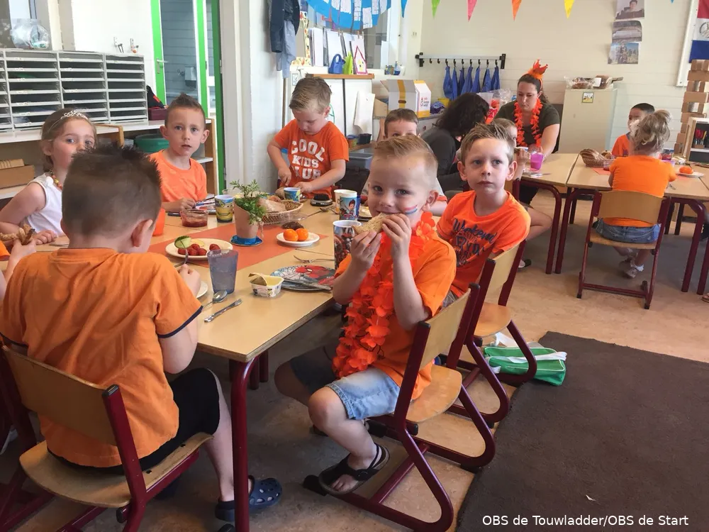 Wat een bedrijvigheid was er op vrijdag 20 april. Om 8.00 uur werden de tafels al gedekt voor alle kinderen van OBS de Touwladder en OBS de Start. Om half 9 zijn we gestart met het Koningsontbijt.
