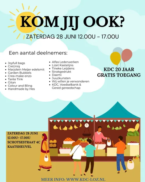 KAATSHEUVEL – Op zaterdag 28 juni viert KDC in Kaatsheuvel haar 20-jarig bestaan met een gezellige zomermarkt voor jong en oud. Tussen 12.00 en 17.00 uur is iedereen welkom aan de Schotsestraat 4C. De toegang is gratis.