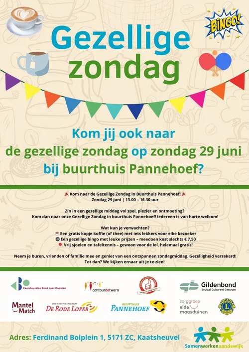 KAATSHEUVEL - Zin in een gezellige middag vol spel, plezier en ontmoeting? Op zondag 29 juni ben je van harte welkom tijdens de Gezellige Zondag in buurthuis Pannehoef in Kaatsheuvel. De middag duurt van 13.00 tot 16.30 uur en staat helemaal in het teken van ontspannen samenzijn.