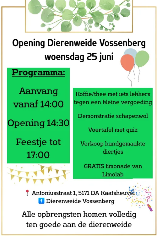 KAATSHEUVEL – Op woensdag 25 juni wordt de Dierenweide Vossenberg feestelijk geopend met een gezellige middag voor jong en oud.