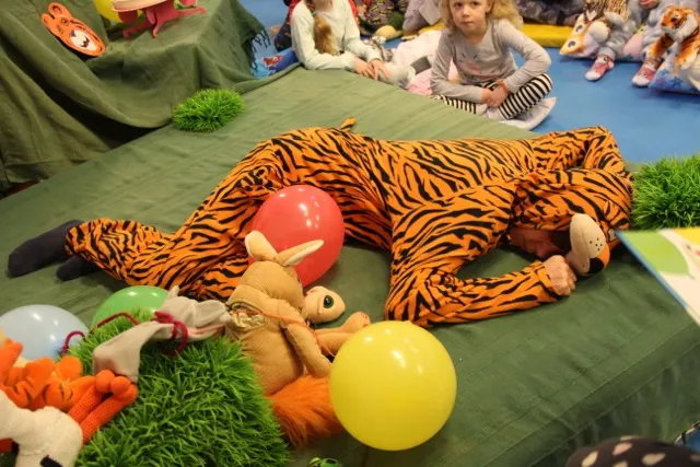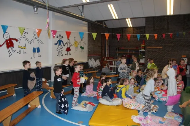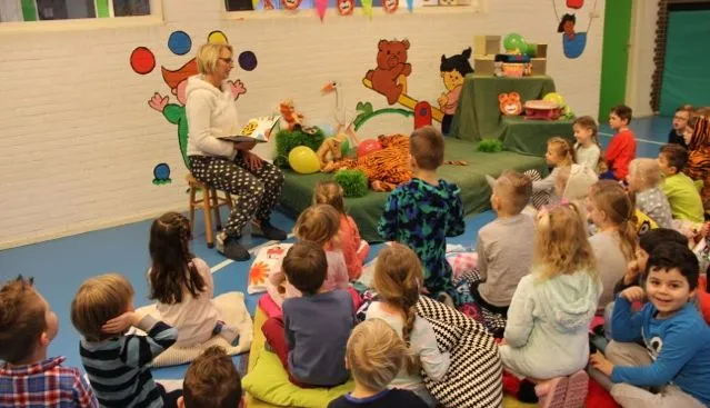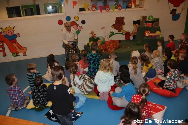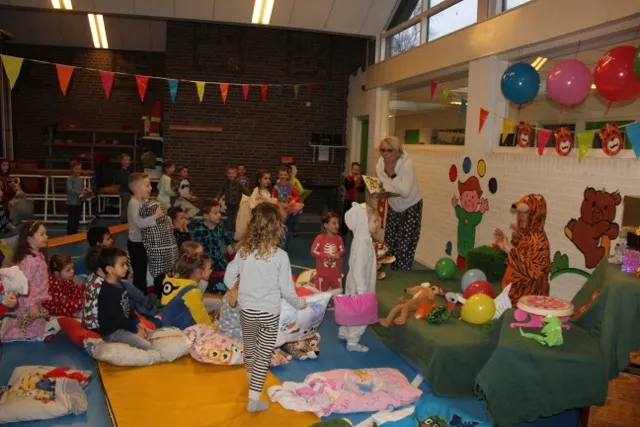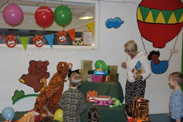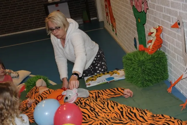 Juffrouw Yvonne las het verhaal interactief voor en de slapende tijger was juf Marja. Zij speelde samen het hele verhaal met allerlei knuffels en ballonnen. In pyjama en op een kussen zaten de kleuters aandachtig te luisteren. De juffen hadden er een heel mooi feest van gemaakt. Het landelijke festijn duurt tot met zaterdag 3 februari.