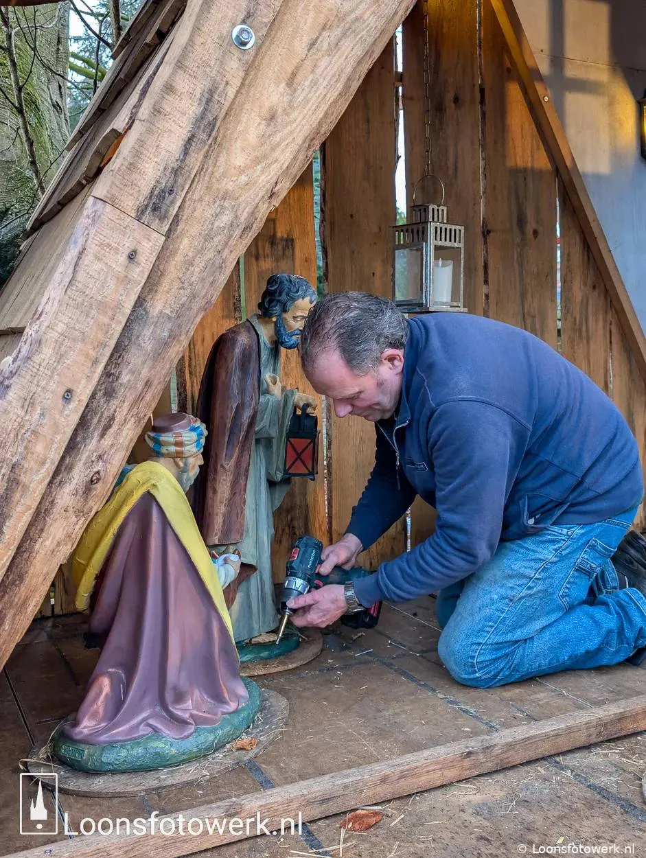 In de ochtend halen de vrijwilligers alle onderdelen uit de opslag. Daarbij bekijken zij opnieuw de aanwijzingen die nodig zijn voor een juiste opbouw. Dankzij jarenlange ervaring weten zij precies hoe de kerststal moet worden opgebouwd. Toch gaat er af en toe iets mis. Een balk op de verkeerde plek of een onderdeel dat anders staat dan gepland zorgt soms voor een korte onderbreking. De groep lost dat direct op en werkt gemoedelijk verder.