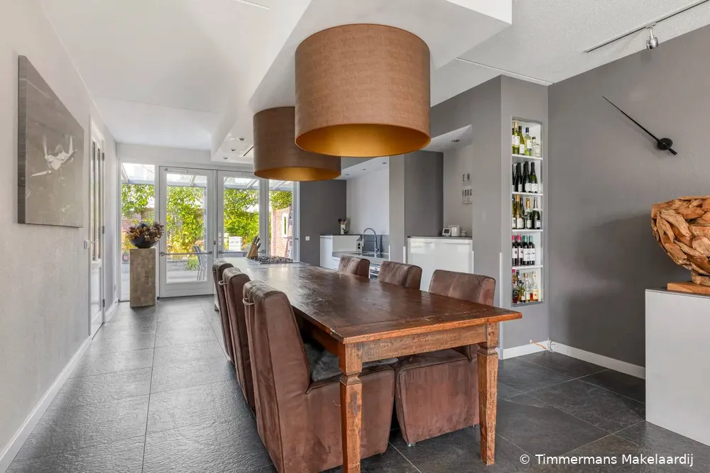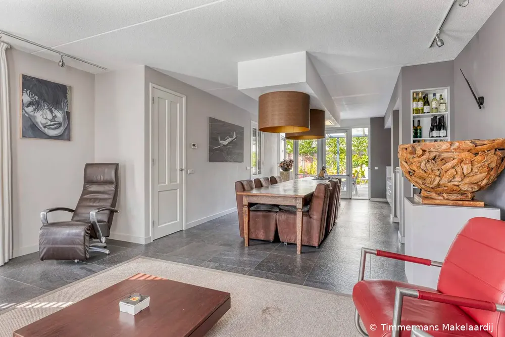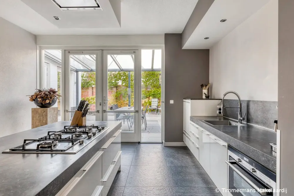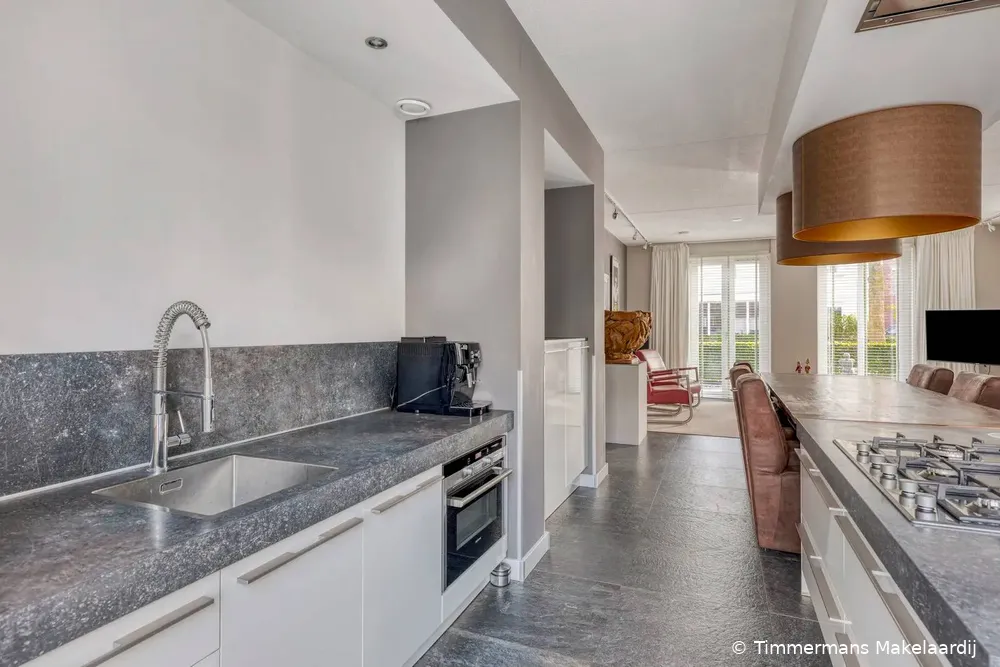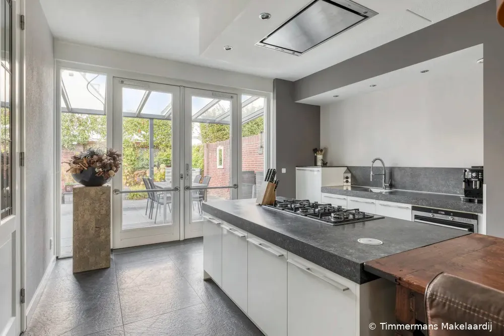 Er wacht je een ruime woonkamer/woonkeuken met een luxe keukendesign, uit ca. 2015. De keuken met kookeiland is op rolstoelvriendelijke hoogte gerealiseerd, maar kan eenvoudig hoger worden gemaakt. Het eiland is voorzien van (lade-) kasten, kookgedeelte (gas) 5 pitten en een wokbrander, ingebouwde afzuiging met afstandbediening en verlichting (weggewerkt in koof). Aan overzijde een werkblad met kasten in een nis, voorzien van een; koelkast, combioven, vaatwasser en spoelbak met keukenmengkraan. Aansluitend nog een nis met op maat gemaakte servieskast en inbouwspots. De keuken is aan de achterzijde van de woning gelegen en geeft via openslaande tuindeuren toegang naar een heerlijke achtertuin met glazen overkapping.