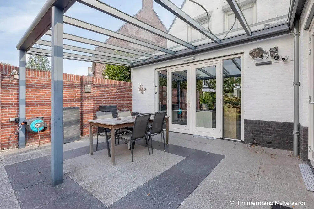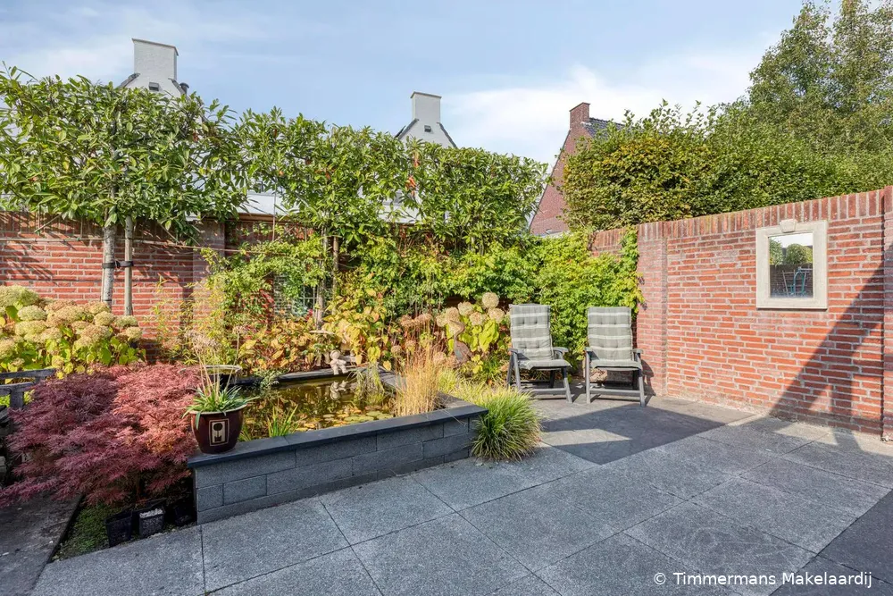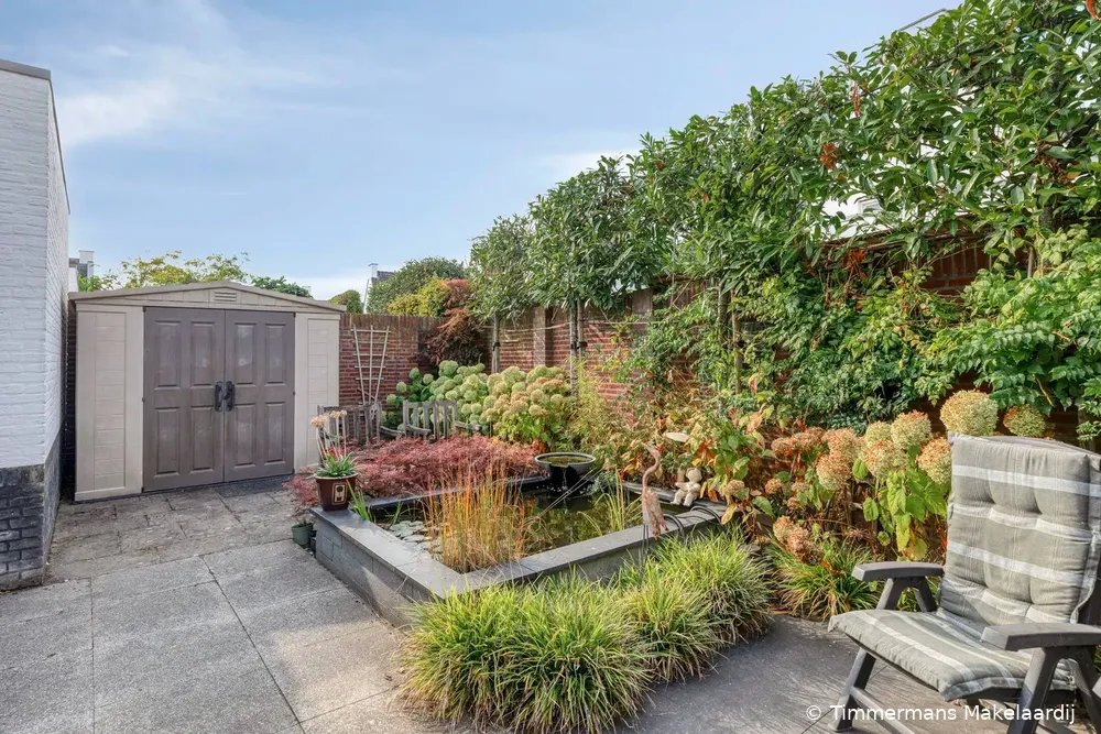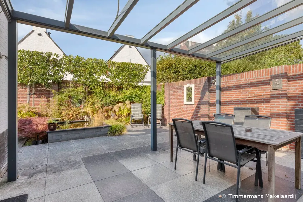 Sfeervolle achtertuin, gelegen op het zonnige noordwesten met sierbestrating, buitenkraan, vijverpartij, extra berging, verlichting en stroom. Onder de glazen overkapping kunt u heerlijk genieten van het buitenleven, deze is tevens voorzien van een elektrisch zonnescherm.