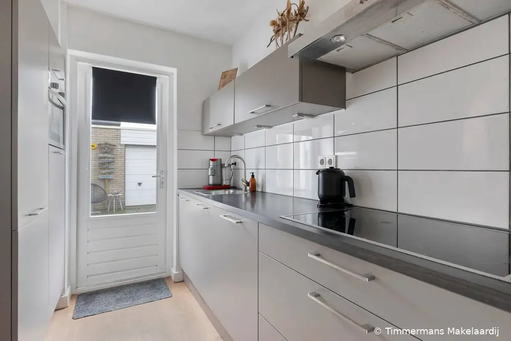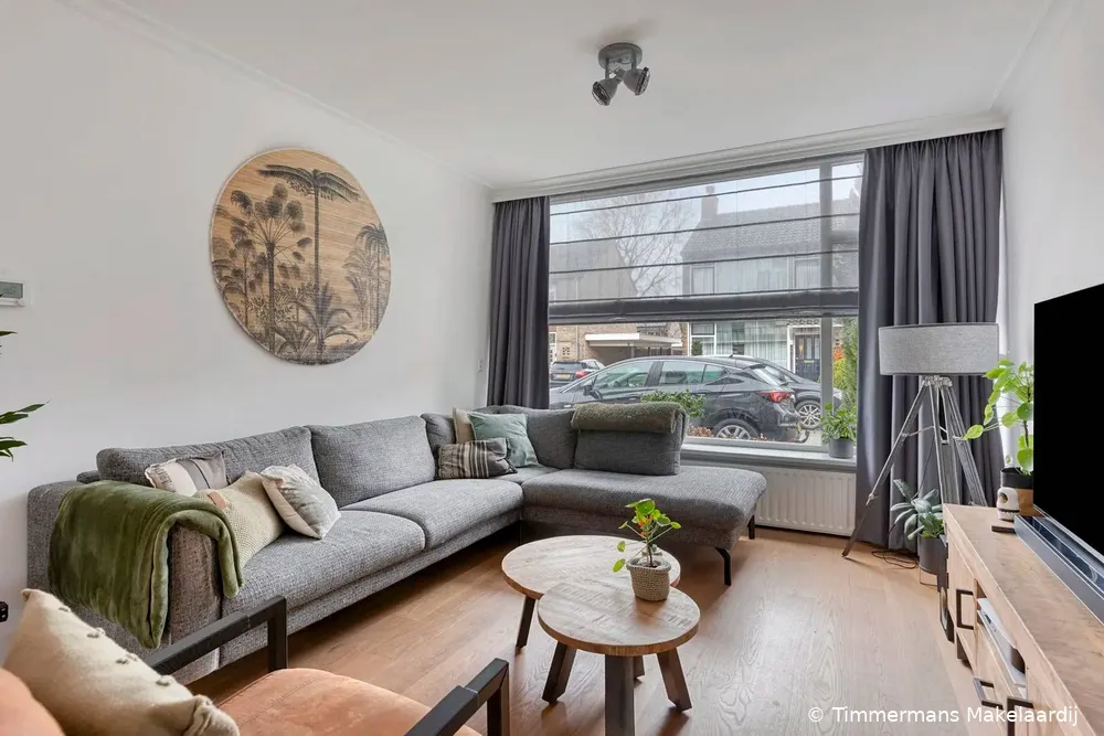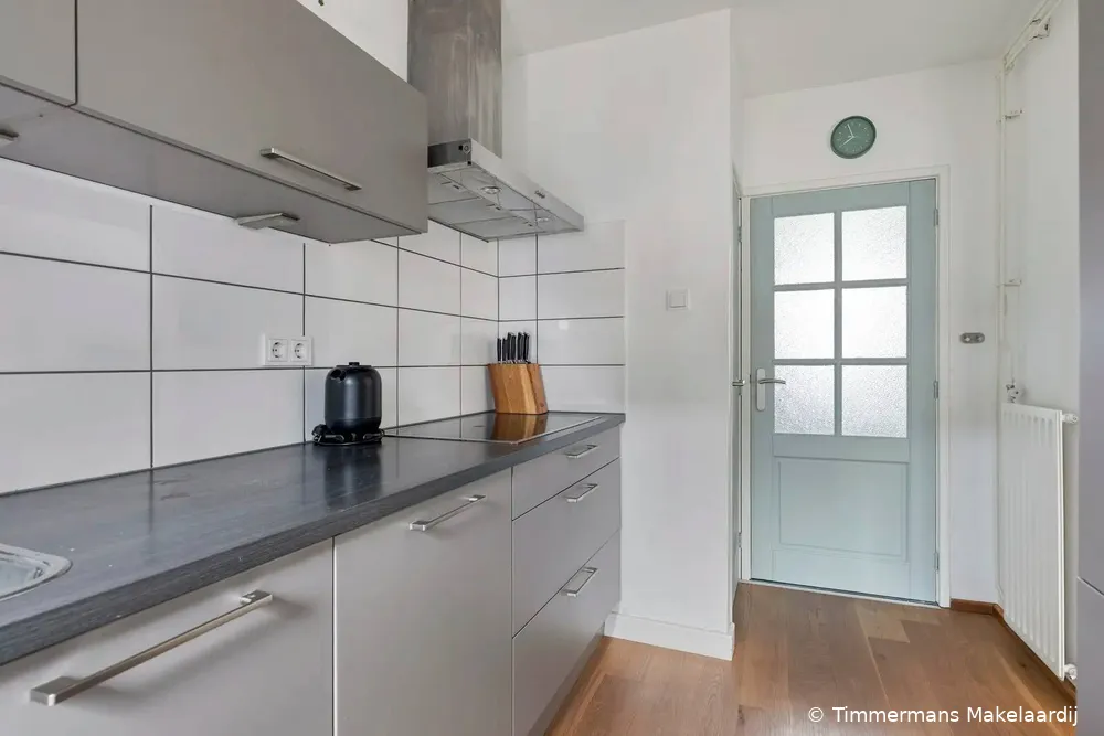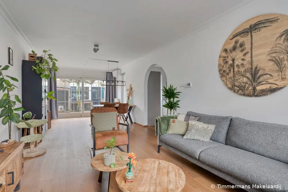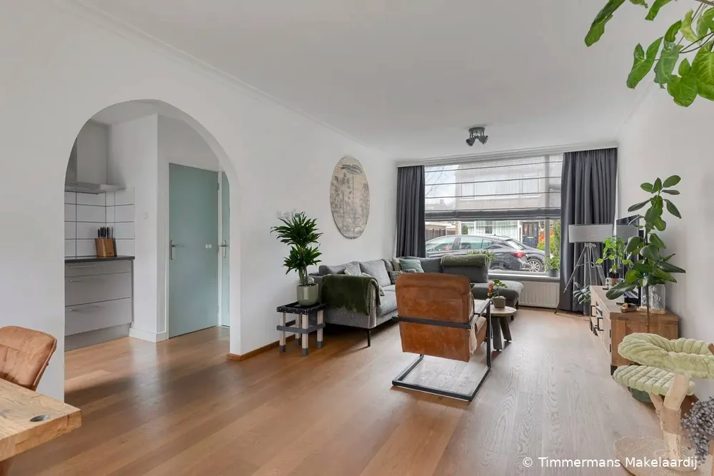 Hal/entree met nette tegelvloer, meterkast en een moderne (vernieuwde) toiletruimte voorzien van wandcloset, fonteintje en radiator. Vanuit de hal is er directe toegang tot de keuken. Royale uitgebouwde woonkamer met strak gestucte wanden en een gestuct plafond voorzien van sierlijke plafondlijsten. De woonkamer beschikt verder over een fraaie parketvloer, airconditioning en een kantel/kiep schuifpui die directe toegang biedt tot de achtertuin en zorgt voor veel lichtinval. Via een stijlvolle boog is de moderne keuken (2019) bereikbaar. De keuken is voorzien van een parketvloer, plafondspots en diverse inbouwapparatuur, waaronder een vaatwasser, oven, keramische kookplaat, afzuigkap en koelkast. Daarnaast beschikt de keuken over een praktische kastenwand met volop bergruimte en een provisiekast. Vanuit de keuken deur naar de achtertuin.