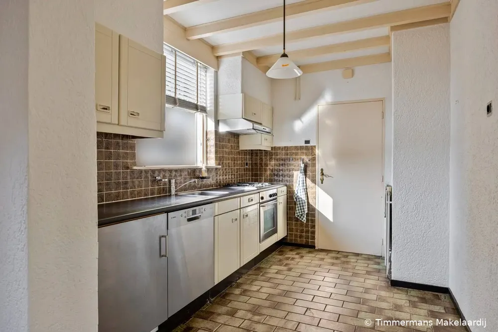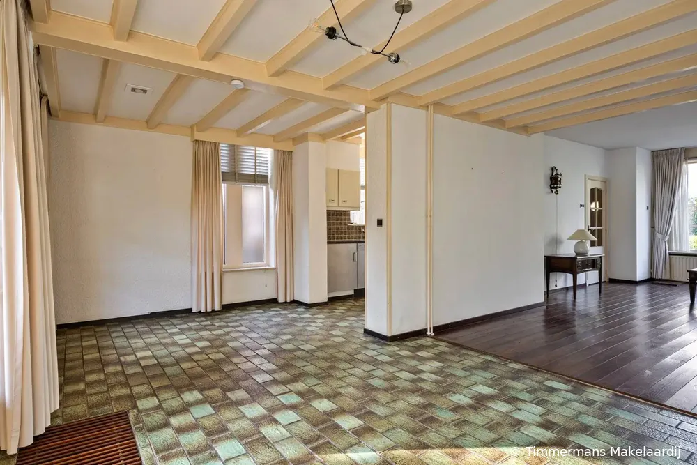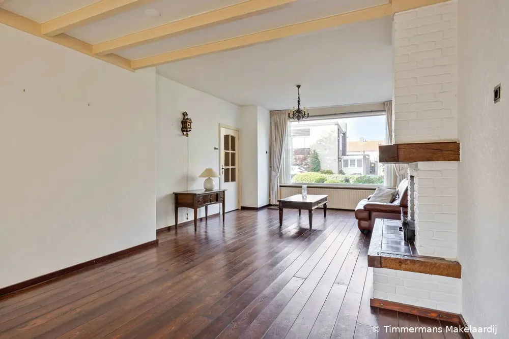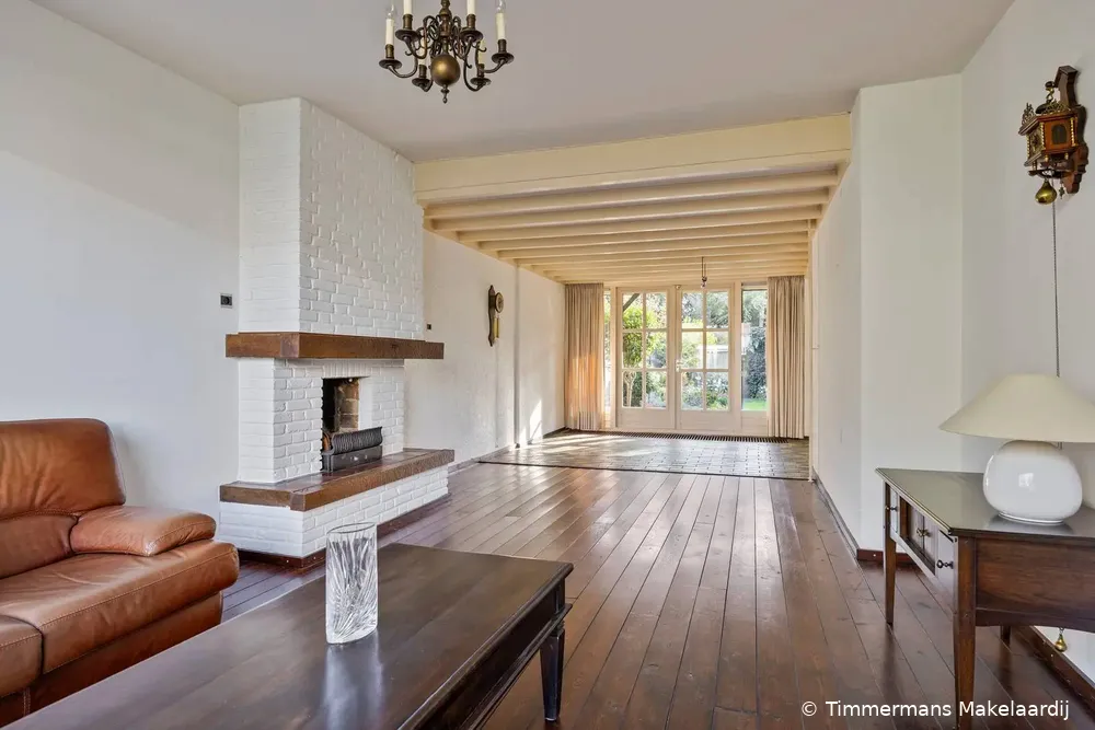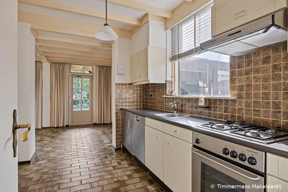 Ruime woonkamer van 41 m2 met veel lichtinval, open haard met schoon metselwerk schouw, houten vloerdelen en openslaande deuren naar de achtertuin en overkapping. Aan de achterzijde is de woning uitgebouwd, waardoor hier nu een ruime eetkamer is gerealiseerd. Deze eetkamer staat in open verbinding met de aangrenzende keuken en is voorzien van een tegelvloer en een sfeervol balkenplafond. De keuken is gedateerd, rechte opstelling en voorzien van diverse inbouwapparatuur t.w. gaskookplaat, afzuigkap, koelkast, vaatwasser en een oven en via een deur toegang naar de overkapping.