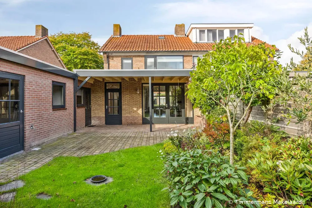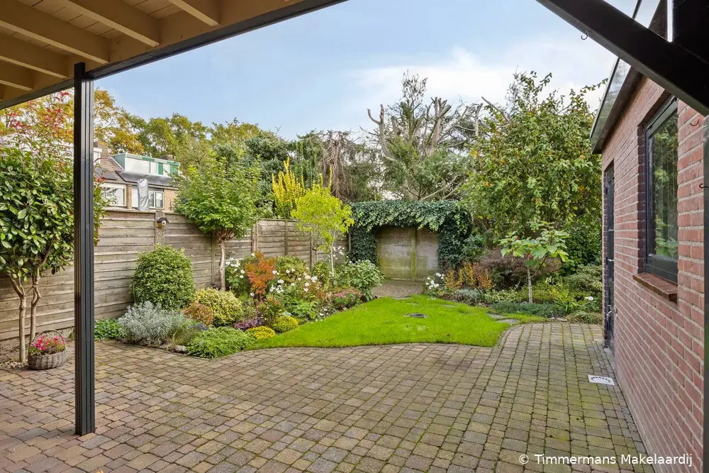 De woning beschikt over een verzorgde achtertuin met terrassen, gazon en plantenborders gelegen op het zonnige zuidoosten met overkapping. Vanuit de achtertuin toegang naar een aangebouwd stenen garage met aansluiting wasapparatuur, c.v.-opstelling (type Vaillant, bouwjaar ± 2016). De garage is momenteel in twee delen opgesplitst met een tussenwand. Deze wand is eenvoudig te verwijderen waardoor er één grote, open ruimte ontstaat. Perfect voor extra opslag, hobbyruimte of het stallen van auto of fietsen.